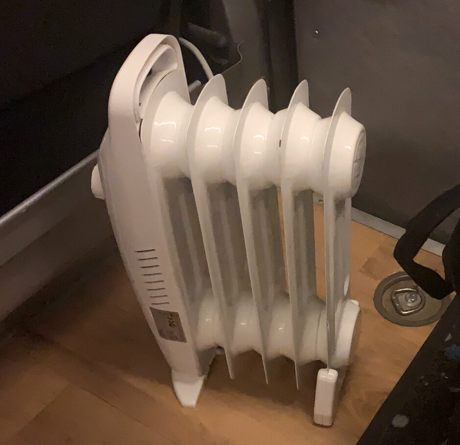 Yhden kesän pärjäsin ihan ok tällä varustuksella, mutta seuraavana keväänä iski ihan mahdoton retkeilyvimma jo maaliskuussa. Hankien madaltuessa koitin kuumeisesti keksiä keinoa retkikauden aikaistamiseksi, siksihän tämän pakun olin hankkinut. Tarvitsisin siis tehokkaamman lämmittimen ja siihen ei enää hupiakku riittäisi. Asennutin Ekiin sisätöpselin johon saisi sähköä tolpasta. Ratkaisu toimisi tietty vain leirintäalueilla tai pihoissa yöpyessä, mutta olisi tyhjää parempi. Hommasin myös tehokkaamman puhaltimen mikä tarkoitti myös äänekästä, ja yhden yön jälkeen puhallin päätyi sukkelasti uuteen kotiin. Sain ystävältäni vinkin, että perinteinen öljypatteri voisi olla hiljainen ja turvallinen vaihtoehto. Muutamalla kympillä hankittu minikokokoinen lämmittäjä mahtuikin kätevästi sängyn ja sivuoven väliin ilman välitöntä tulipalon vaaraa. Testiyönä ulkolämpötila oli muutaman asteen plussan puolella, mutta minulla oli autossa oikein miellyttävä lämpötila. Patteri meni myös jatkoon, ja on siellä edelleen.