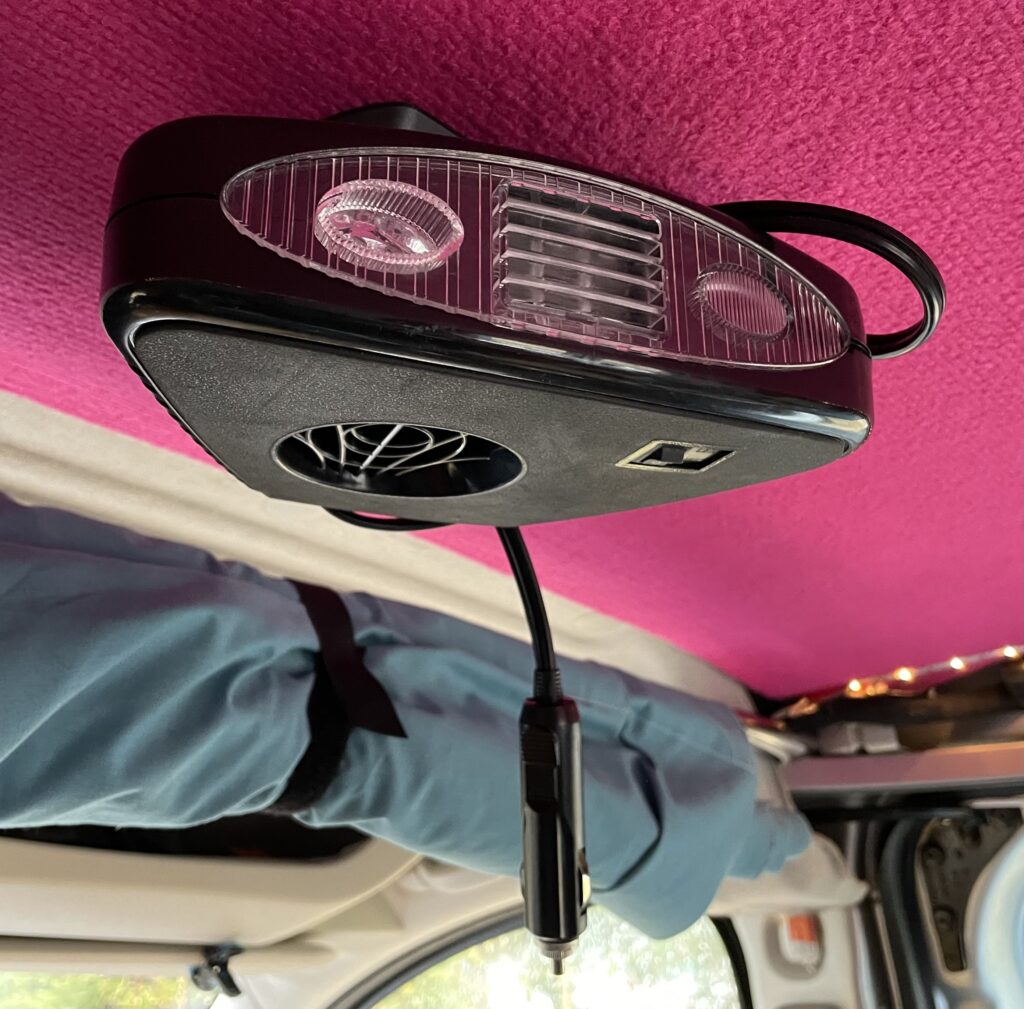 Paitsi etten pärjännytkään. Jo ensimmäisellä koereissulla kaipailin edes pientä lämmintä hönkää hyytäviin aamuyön tunteihin vaikka nukuin untuvapussissa. Seuraavalla Bilteman reissulla mukaani tarttui (puoliksi vitsinä) 12V tökkelillä toimiva sisätilanlämmitin, joka oli teholtansa kokonaista 130W. Laskeskelin, että hupiakullani sitä voi käyttää viisi-kuusi tuntia, ennen kuin akku olisi tyhjä. Kiinnitin lämmittimen takatilan kattoon sen mukana tulleella adapterilla. Masiina pääsi testiin Norjan reissussa, jonka aikana totesin, ettei 130W varsinaisesti lämmitä, mutta nostaa kuitenkin lämpötilaa muutamalla asteella ja poistaa kalseaa kosteutta. Lisäksi lämmittimessä oli myös lamppu ja tuuletin, joten se pääsi jatkoon potentiaalisesti hyödyllisenä kapineena.