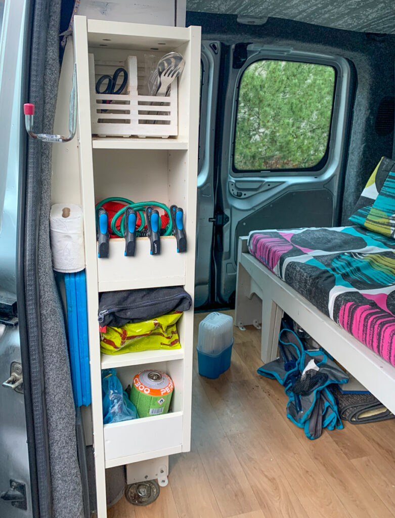 Ensimmäisenä kohteena oli hylly. Hyllyssä ei ollut kaappeja, vaan kaikki tavarat olivat esillä tai muovikoreissa. Hyllyjen eteen niitatut kuminauhat olivat rumia, eivätkä loppujen lopuksi estäneet tavaroiden lentelyä ympäriinsä kunnon töyssyyn ajaessa. Tila tuntui pieneltä ja sekavalta. Halusin hyllystä monikäyttöisemmän ja tavarat piiloon. Purin pois vesikanisterihyllyn joka oli jo alkanut homehtumaan ja päätin pitää vedet ulkosalla, jossa sitä saisi lorotella maahan vapautuneesti. Hyllyn sivuun, aivan oven viereen, väsäsin vanhasta cd-hyllystä Tärkeiden Asioiden Hyllyn, josta saisin näppärästi napattua sääskimyrkyt, vessapaperit ja puukot mönkimättä autoon sisään.