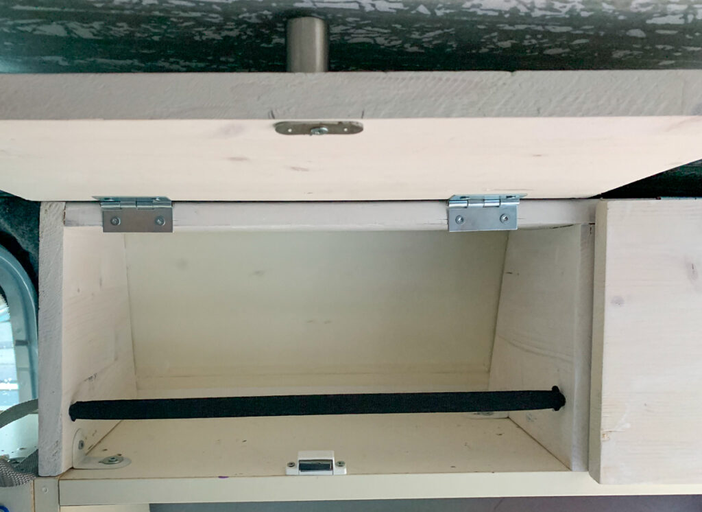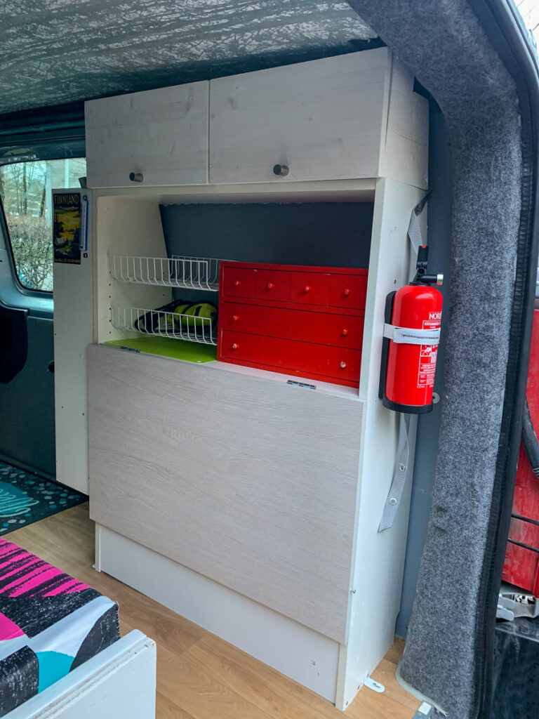 Hyllyn ja katon väliin jäi käyttämätöntä tilaa kun poistin siitä ruokakorit. Näin pienessä autossa ei hukkatilaa sallita! Rakensin hyllyn päälle pienet ruokakaapit, mikä oli ihan helvettiä, koska autossa ei edelleenkään ollut yhtään suoraa pintaa. Tein kaapit pari kertaa uudestaan ja nyhräsin ovet millintarkasti samaan tasoon ettei mielenrauhani järkkyisi niitä katsellessa. Lopputulos oli parempi kuin odotin.