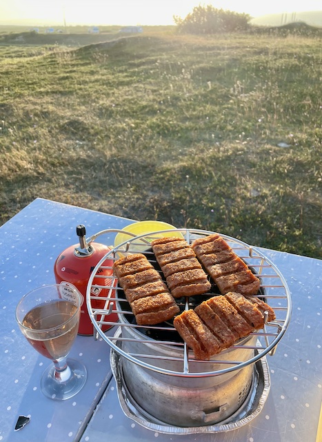 Yksinkertaisin ohje oli grillata ritilällä, joka oli asetettu Trangian päälle. Done that, ei jatkoon. Seuraava ohje sisälsi lämmönjakajalisäosan: rei’itetty säilykepurkki ylösalaisin kaasupolttimen päällä. Kokeilin tätäkin, mutta liekki ei saanut tarpeeksi ilmaa palaakseen kunnolla. Yhdistelin kaikki vinkit ja ripustin purkin ritilään rautalangalla niin, että se roikkuu vapaasti ilmassa polttimen yläpuolella ja liekki saa näin tarvitsemansa ilman ja palaa kauniisti. Se oli sitten siinä ja on toiminut mainiosti! Jos innostut askartelemaan niin pari lisävinkkiä: Sopivin säilykepurkin koko on perus ananaspurkkia hieman laakeampi ja matalampi koko (kuvassa on juurikin tämä huonompi versio). Purkkien pinnoitukset kannattaa käräyttää pois ennen varsinaista grillauskäyttöä. Purkit mustuvat ja ruostuvat käytössä helposti, joten niitä kannattaa samalla vaivalla tehdä useita.