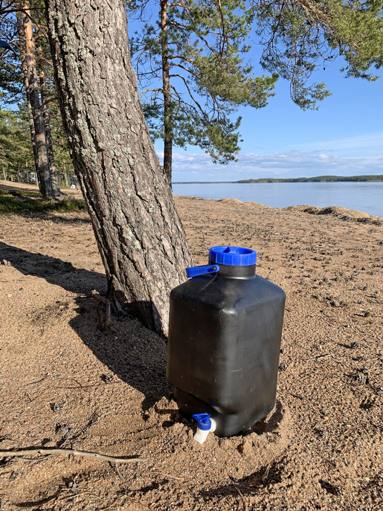 Hässäkän jälkeen oli aika ottaa opiksi. Vesitonkka oli päässyt vuotamaaan koska A: siinä oli vettä B: se oli ohjaamossa C: se oli kylmälakukun vieressä ja ajon aikana hanan nostettava lippa oli todennäköisesti osunut kylmikseen ja tonkka lorissut tyhjäksi. Ei enää koskaan! Vesitonkka sai välittömästi alennuksen pesuvedenlämmittimeksi: pintaan mustaa maalia ja kuljetus ainoastaan tyhjänä. Pähkäilin, että jos kanisterin täyttäisi vedellä ja jättäisi päiväksi auringonpaisteeseen, niin siinä olisi mahdollisesti iltaan mennessä lämmintä vettä. Tämä tuli testattua alkukesän Saimaan reissulla ja sehän tosiaan toimi. Ei nyt mikään sherlock-tason väläys, mutta ihan itse keksitty! Samaisella Saimaan reissulla naapurikaravaanareilla oli tutun oloinen tilanne päällä: vesitonkka oli vuotanut ja he kantoivat kamojaan ulos kuivumaan. Kävi ilmi, että kyseessä oli juurikin saman mallin tonkka. Näiden myyminen pitäisi kieltää lailla.